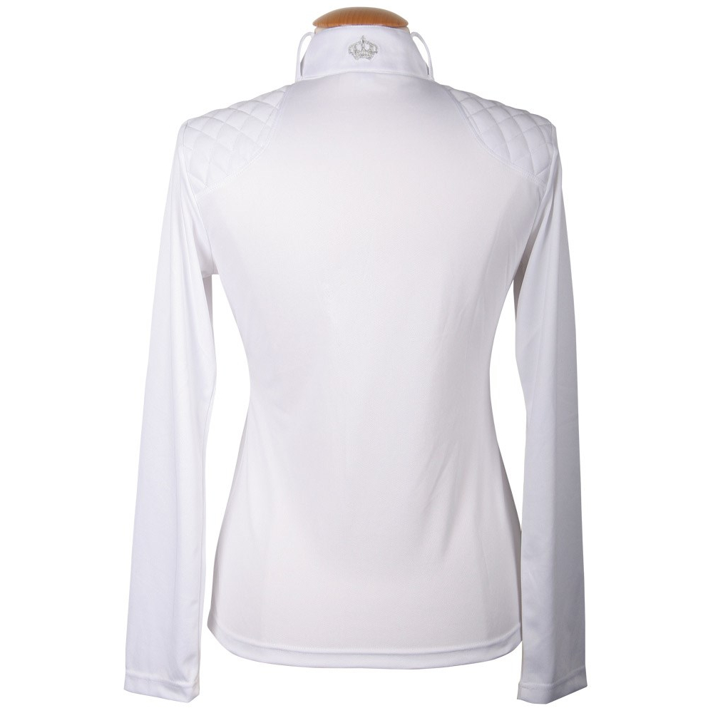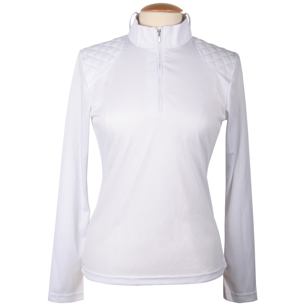 Wedstrijdshirt met lange mouw, opstaande kraag met plaston lussen, ritssluiting met piping voorzijde, gequilte schouderstukken100% polyester